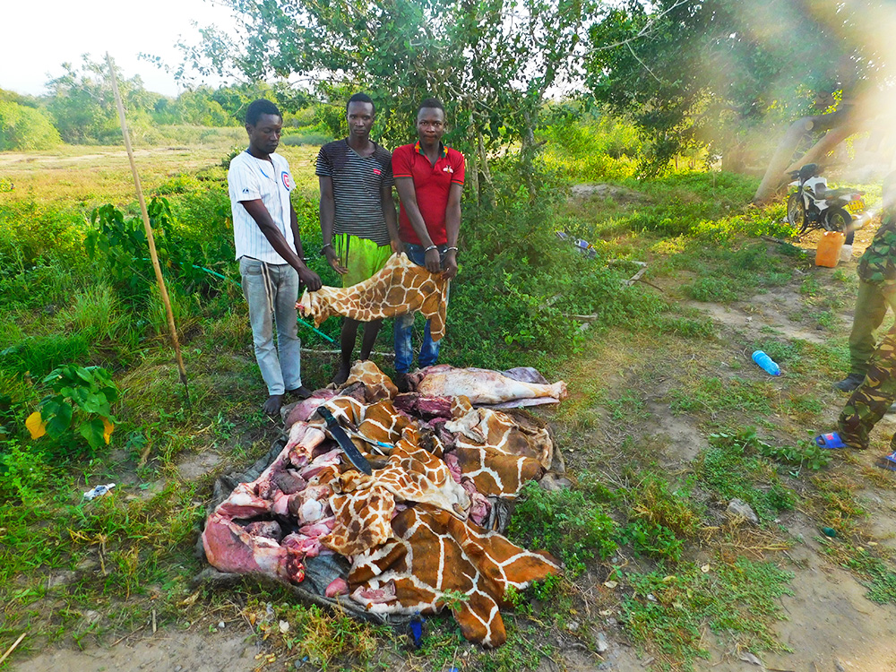 East of Garissa lies Somalia which is overrun by suspected armed militias. The militia make forays into Kenya and also facilitate several illegal activities in our conservation sites. A similar trend has been reported in the south of Garissa, close to the Ishaqbini Hirola Conservancy, where floods from the Tana river often push people to conservation areas; while communities from the neighbouring County in the west of Tana river cross over to kill animals to help them survive. As we have gathered, the bushmeat further makes its way to Somalia, preserved through the indigenous Somali methods locally known as Nyirinyiri or Othkaah, packed in 20 litres jerrycans and are allegedly sold to organized criminal groups. We have since made a series of arrests with the most recent case of three individuals believed to have been the perpetrators of the gruesome killings of giraffes in Garissa County.